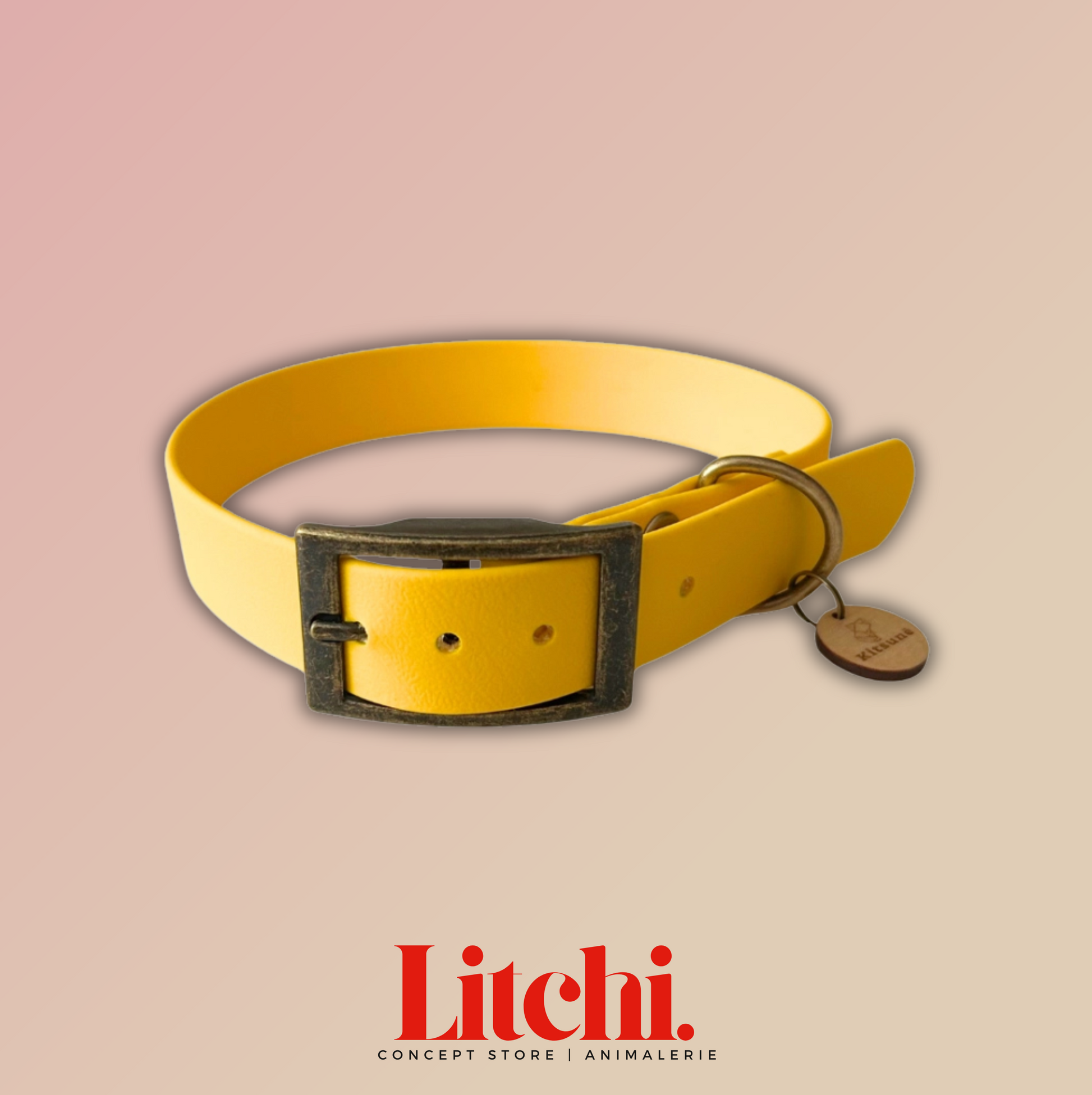 Optez pour un collier en BioThane® jaune alliant style et praticité. Avec sa bouclerie en zinc finition laiton antique et sa médaille en bois Kitsunē, il apporte une touche d’élégance pour les balades en ville ou à la campagne.