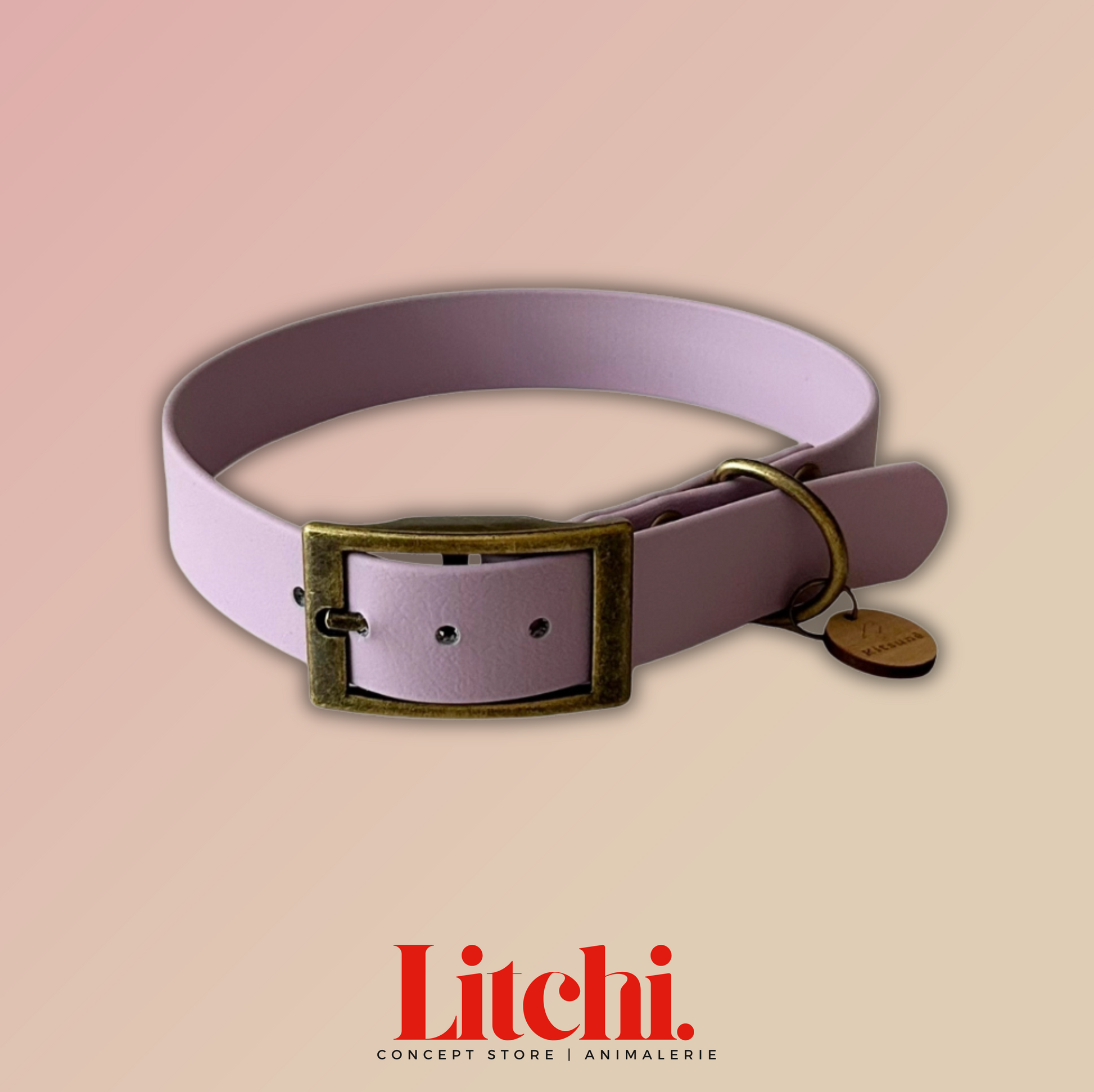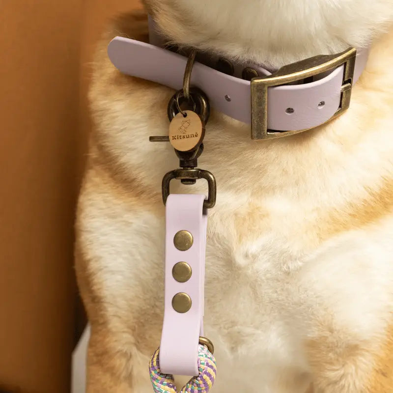 Optez pour un collier en BioThane® lilas alliant style et praticité. Avec sa bouclerie en zinc finition laiton antique et sa médaille en bois Kitsunē, il apporte une touche d’élégance pour les balades en ville ou à la campagne.
