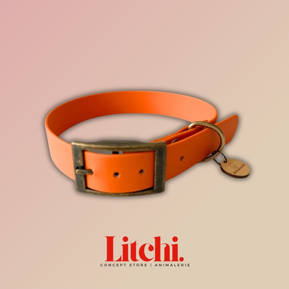 Optez pour un collier en BioThane® orange alliant style et praticité. Avec sa bouclerie en zinc finition laiton antique et sa médaille en bois Kitsunē, il apporte une touche d’élégance pour les balades en ville ou à la campagne.
