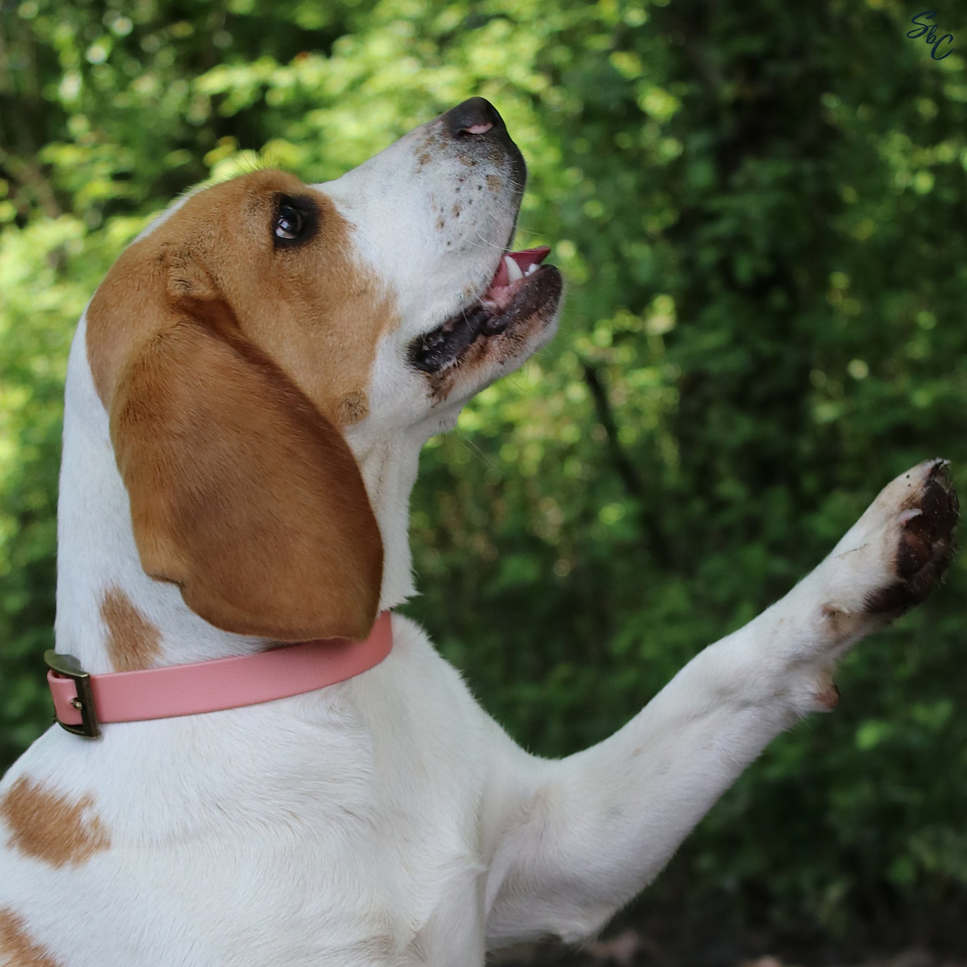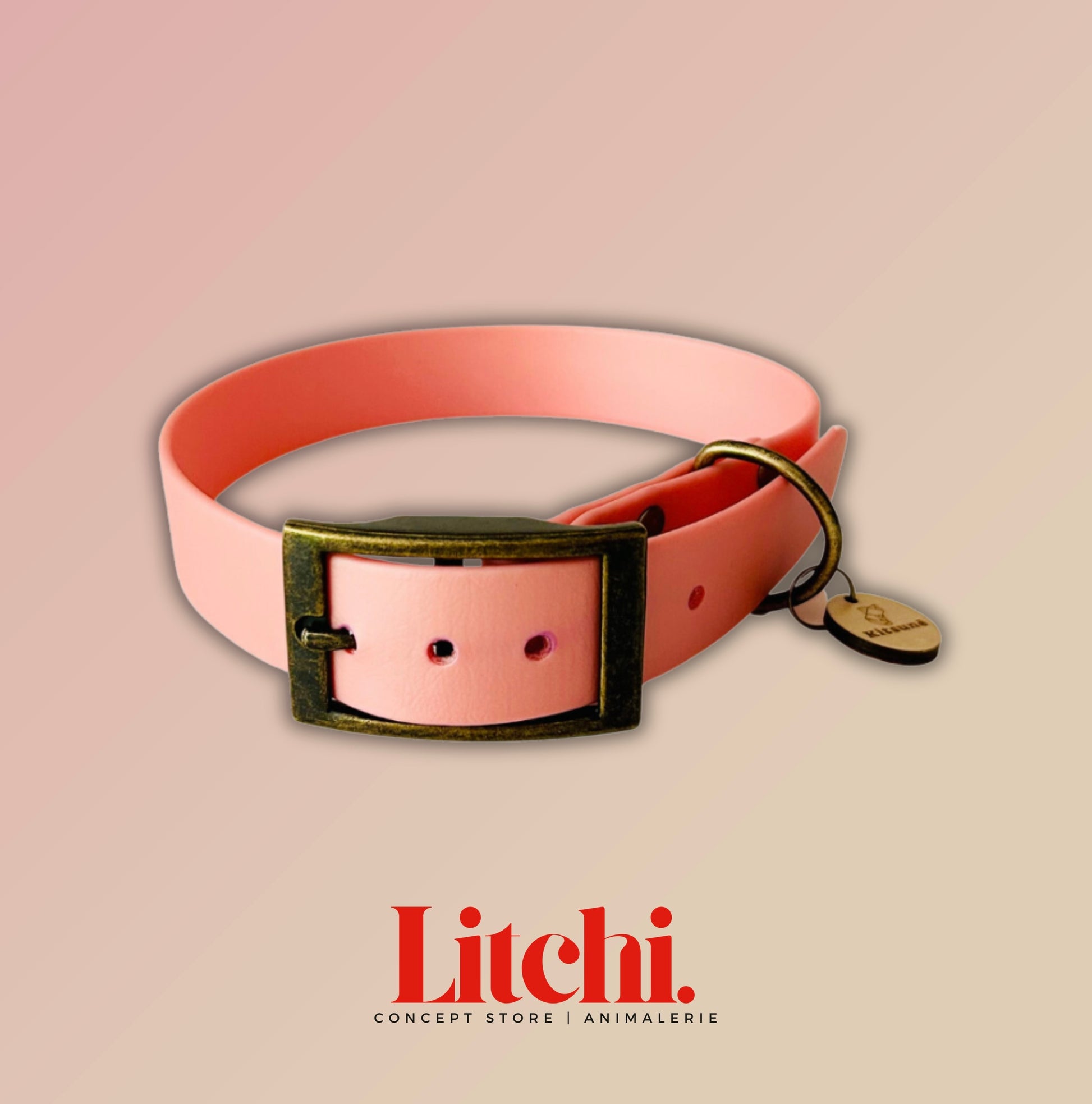 Optez pour un collier en BioThane® rose bonbon alliant style et praticité. Avec sa bouclerie en zinc finition laiton antique et sa médaille en bois Kitsunē, il apporte une touche d’élégance pour les balades en ville ou à la campagne.