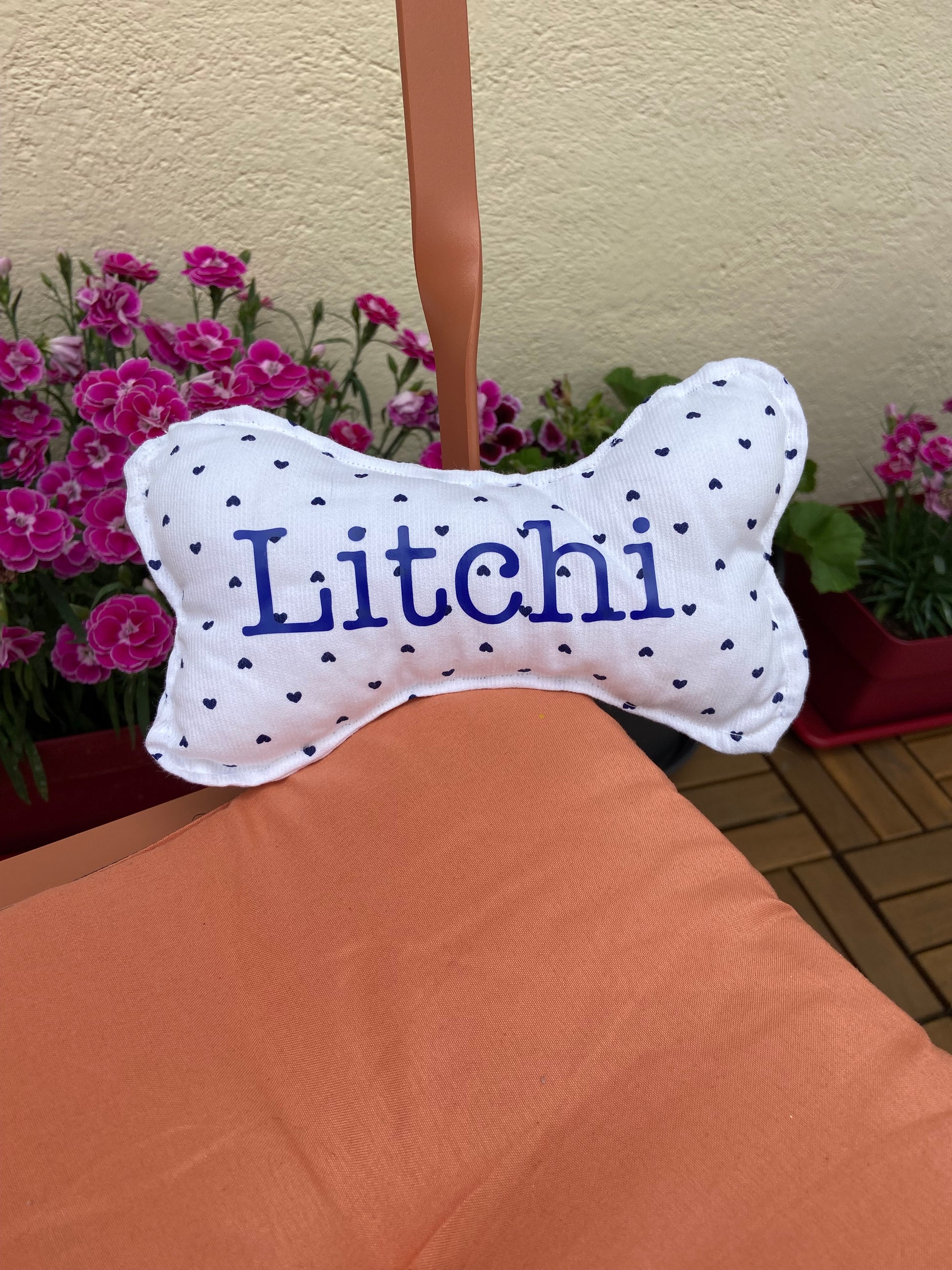 Faites plaisir à votre toutou avec un jouet en forme d’os doux, élégant et entièrement personnalisable ! Cousu avec amour, chaque os porte fièrement le nom de votre compagnon à quatre pattes – comme ici, notre modèle "Litchi" 🌼