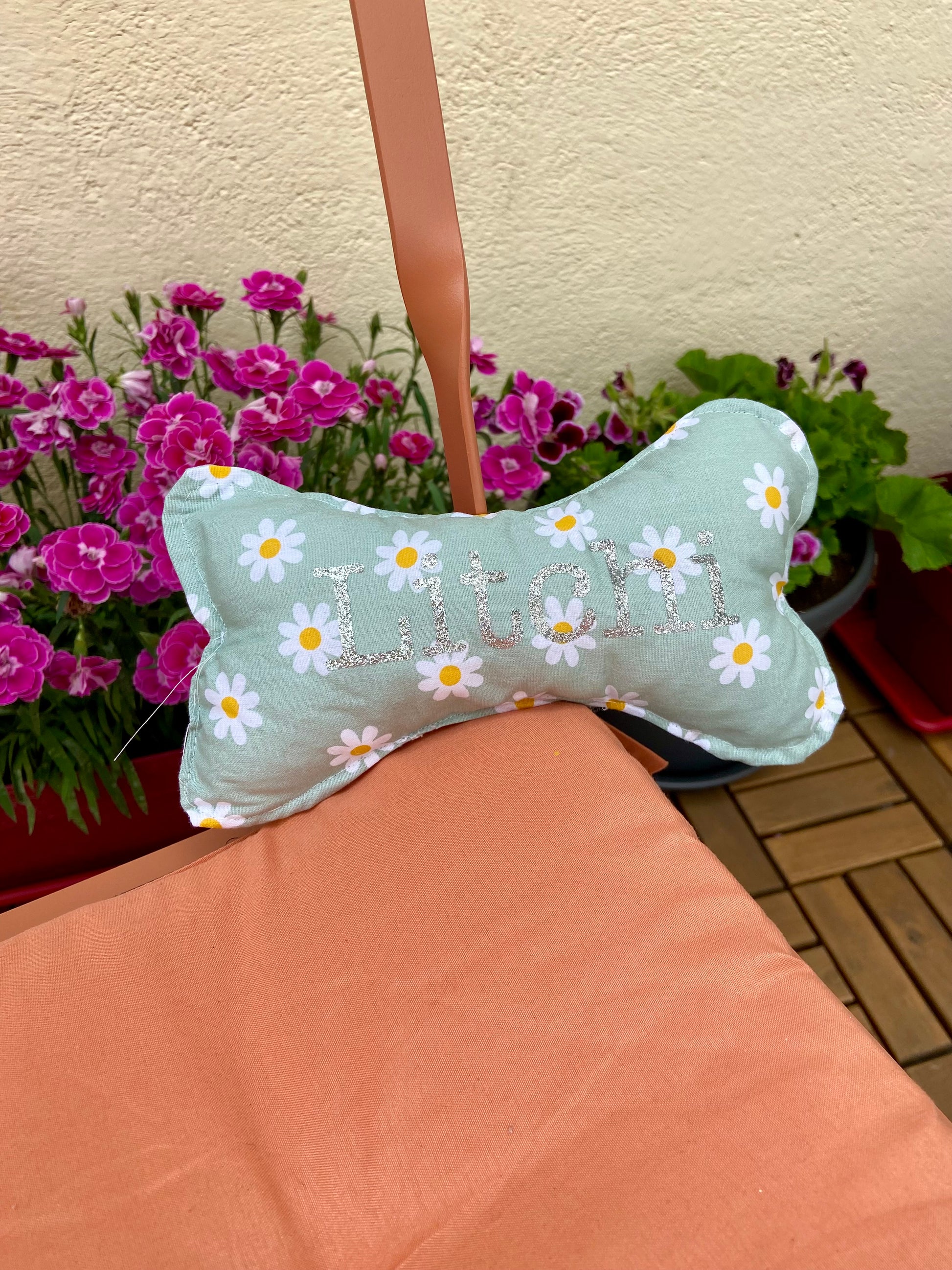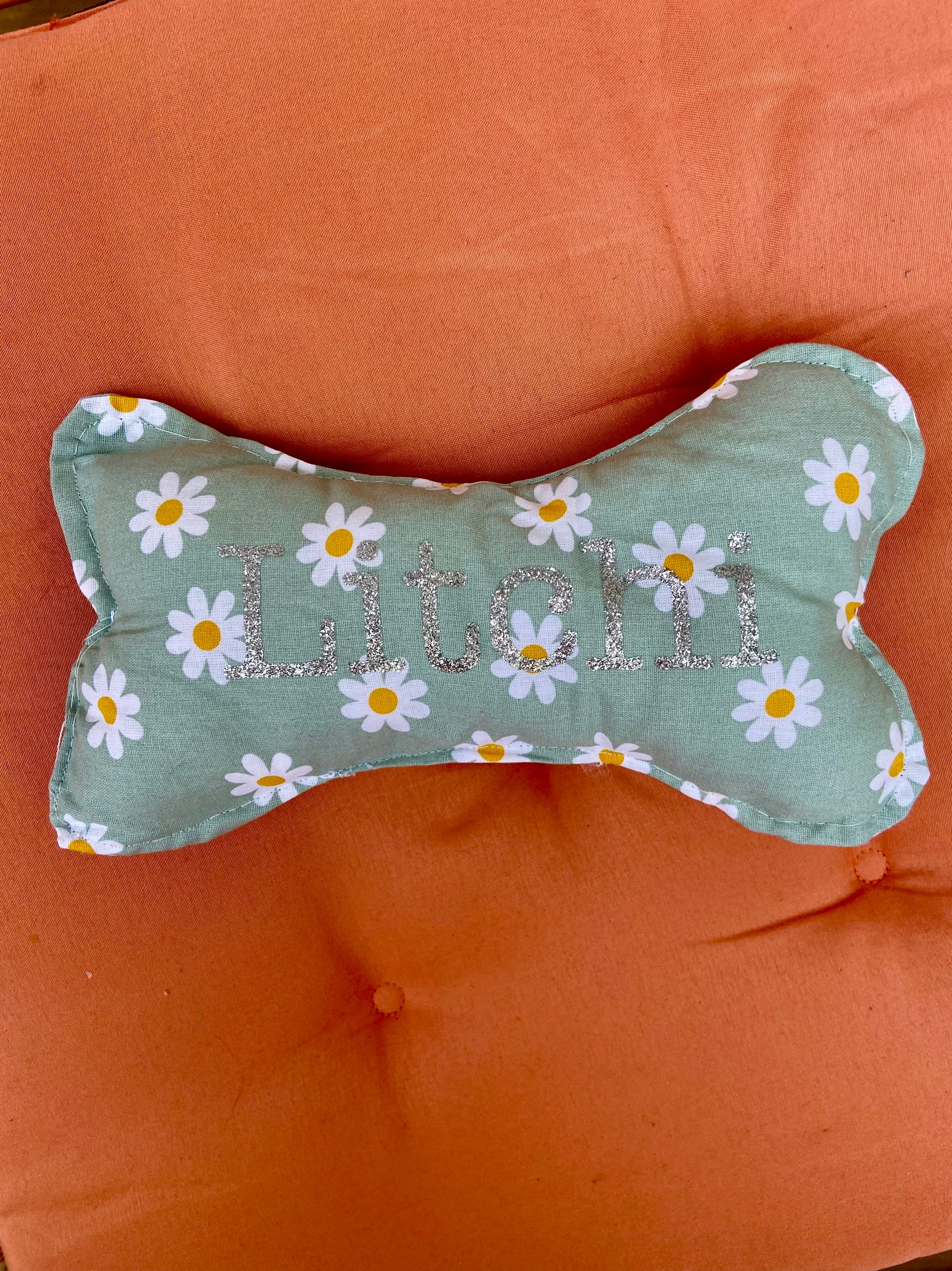 Faites plaisir à votre toutou avec un jouet en forme d’os doux, élégant et entièrement personnalisable ! Cousu avec amour, chaque os porte fièrement le nom de votre compagnon à quatre pattes – comme ici, notre modèle "Litchi" 🌼