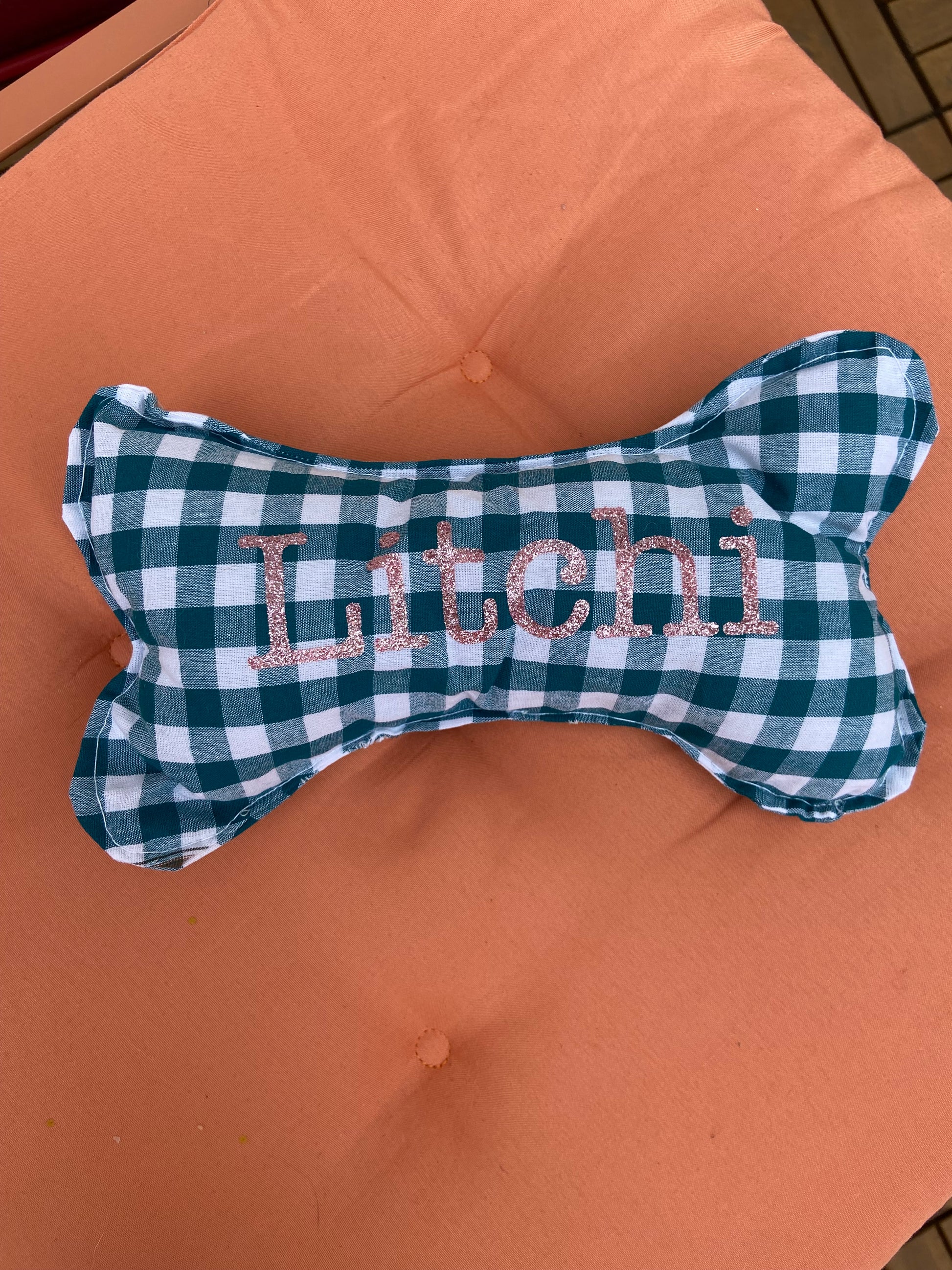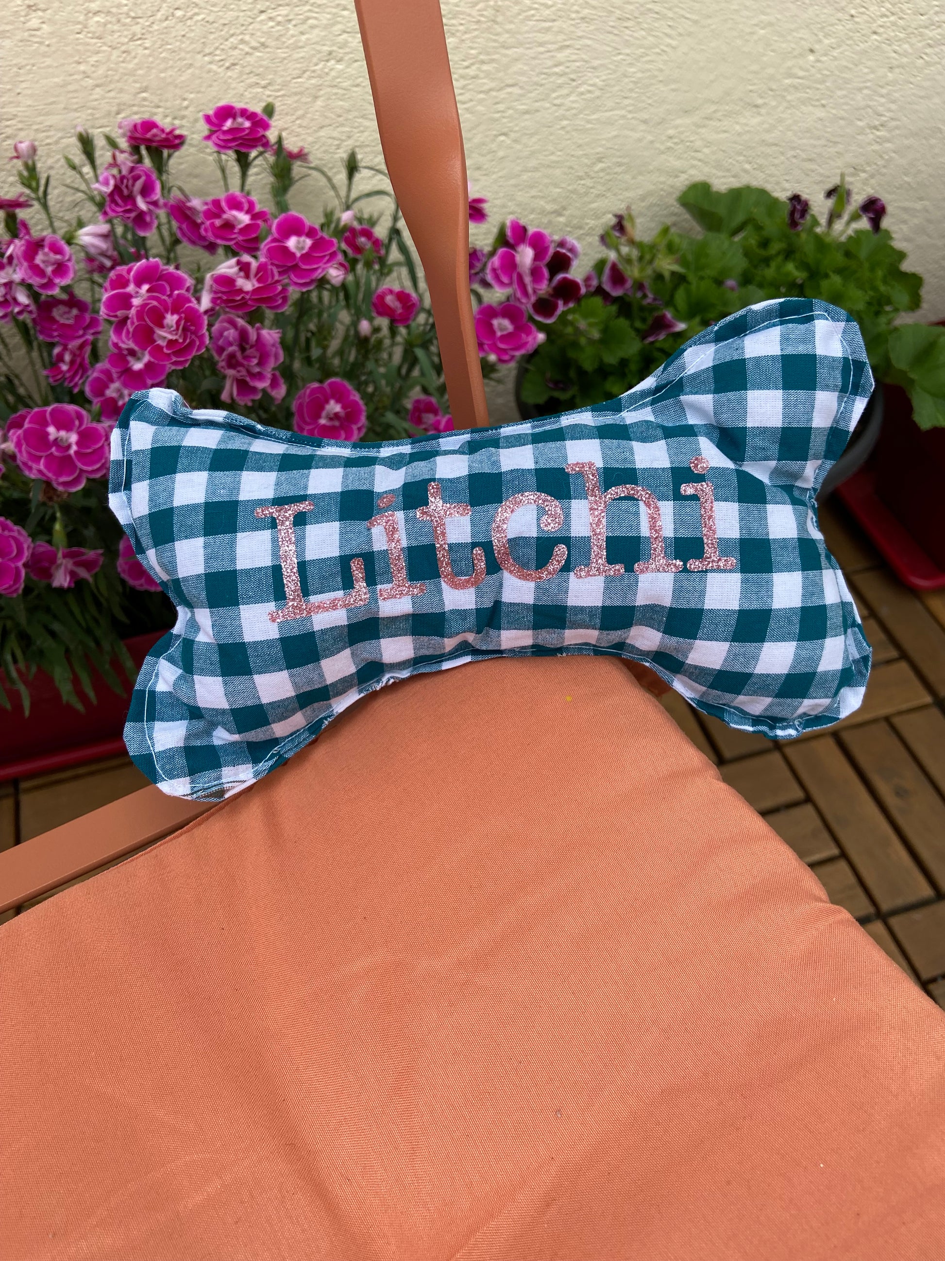 Faites plaisir à votre toutou avec un jouet en forme d’os doux, élégant et entièrement personnalisable ! Cousu avec amour, chaque os porte fièrement le nom de votre compagnon à quatre pattes – comme ici, notre modèle "Litchi" 🌼