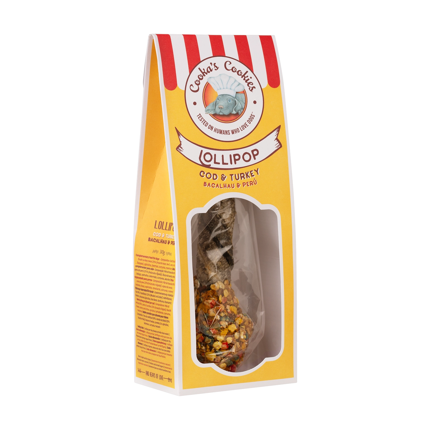 Les sucettes Cooka's Cookies sont des friandises 100% naturelles, fabriquées à la main avec des ingrédients de qualité. Composées d’une tête croustillante à base de dinde, carottes et avoine, fixée sur un bâtonnet de peau de morue pure, elles offrent à votre chien une expérience de mastication unique et gourmande.